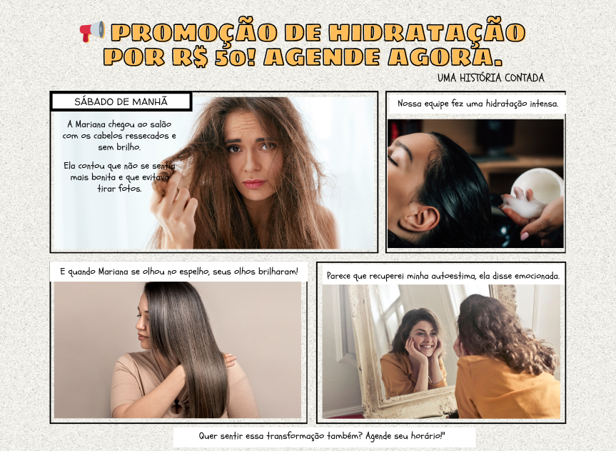 Exemplo Prático: Imagine que você tenha um salão de beleza. Em vez de apenas postar "faça sua hidratação por R$ 50", você pode contar a história de uma cliente que recuperou a autoestima após cuidar do cabelo. Isso gera empatia e faz com que mais pessoas queiram ter a mesma experiência.